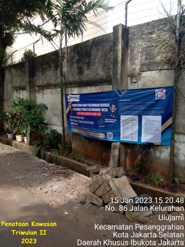 Pelaksanaan kegiatan Penataan Kawasan triwulan II Kelurahan Ulujami Tahun 2023 berlokasi di Jl. Kelurahan RT. 001 RW. 04 Kelurahan Ulujami. Kegiatan ini dilakukan pada periode bulan April sampai dengan Juni Tahun 2023. Luas wilayah yang dilakukan penataan yaitu kurang lebih 500m.